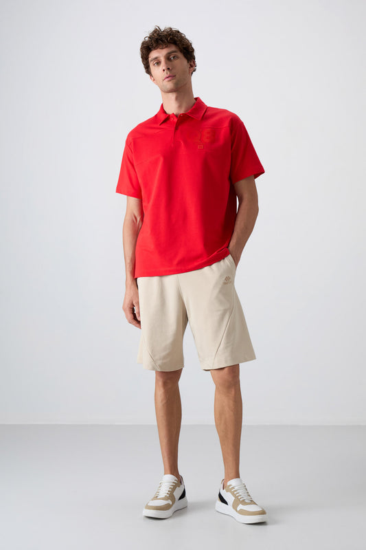 Red Polyester Breathable Textured Thin Flexible Standard Fit Polo Collar Men's Performance T-Shirt - 88392
