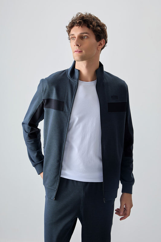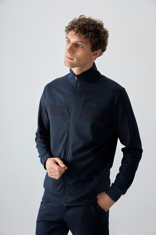 Navy Blue Textured Surface Standard Fit Embroidered Men's Tracksuit Set - 85248