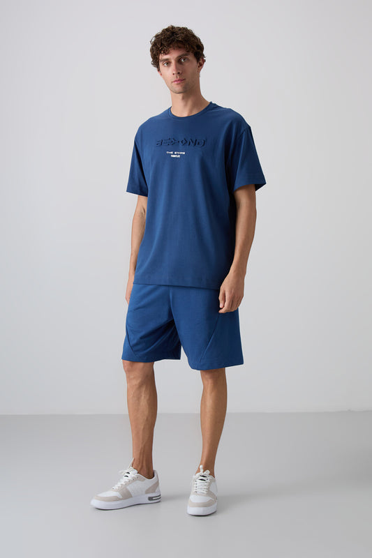Navy Blue Textured Thick Surface Cotton Oversize Fit Basic Men's T-Shirt - 88339