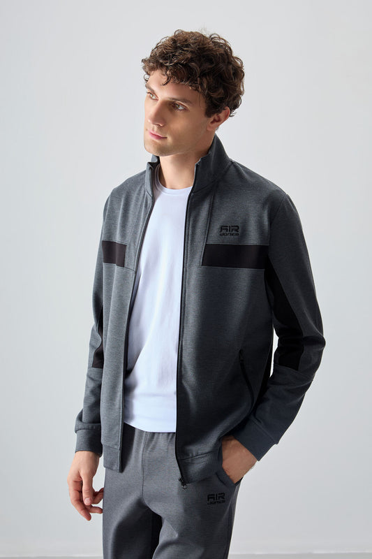 Dark Grey Textured Surface Standard Fit Embroidered Men's Tracksuit Set - 85248