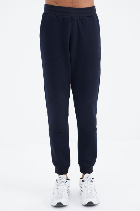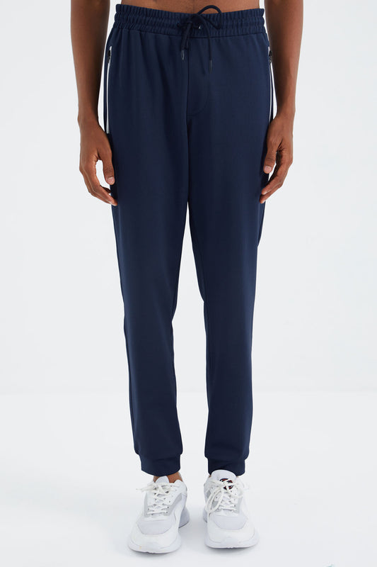 Navy Blue Laced Striped Detailed Relax Fit Men's Tracksuit Bottom - 82106