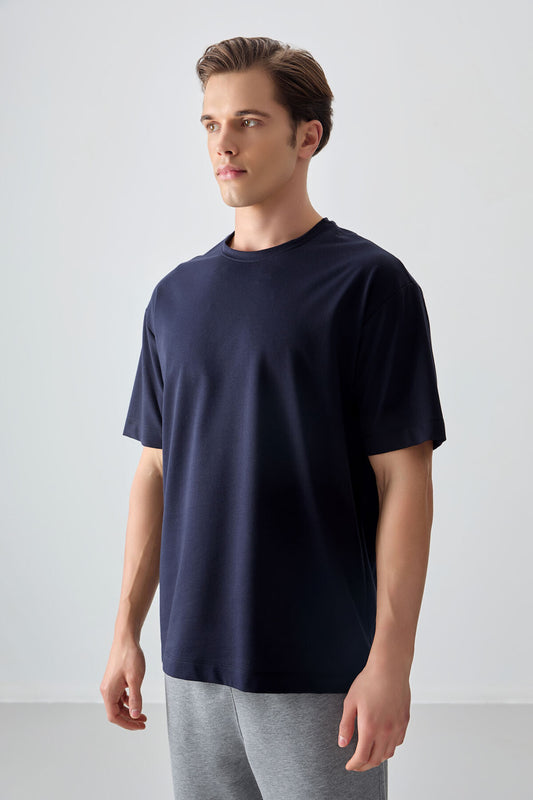 Navy Blue Cotton Thick Soft Textured Oversize Fit Basic Men's T-Shirt - 88377