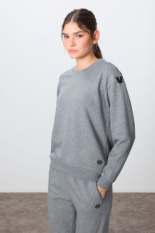 Grey Melange Compact Cotton Thick Smooth Textured O Collar Oversize Fit Women's Tracksuit Set - 95341