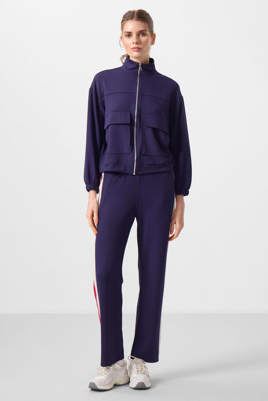 Dark Purple Soft Textured High Collar Oversize Cargo Pocket Women's Crop Top Sweatshirt - 97301