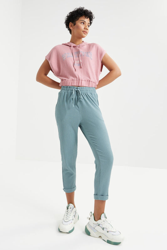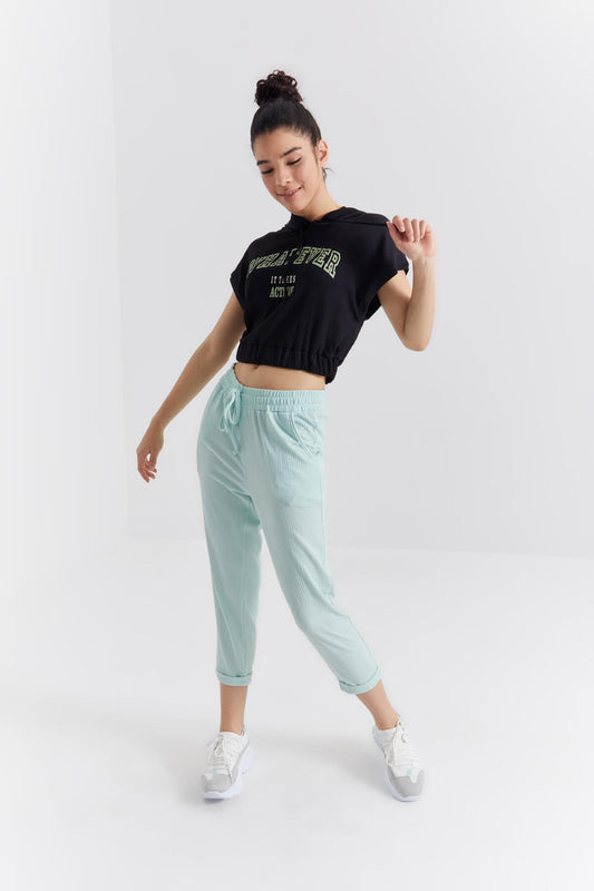 Mint Green Hooded Print Text Elastic Waist Crinkle Fabric Women's Crop Top T-Shirt - 97230