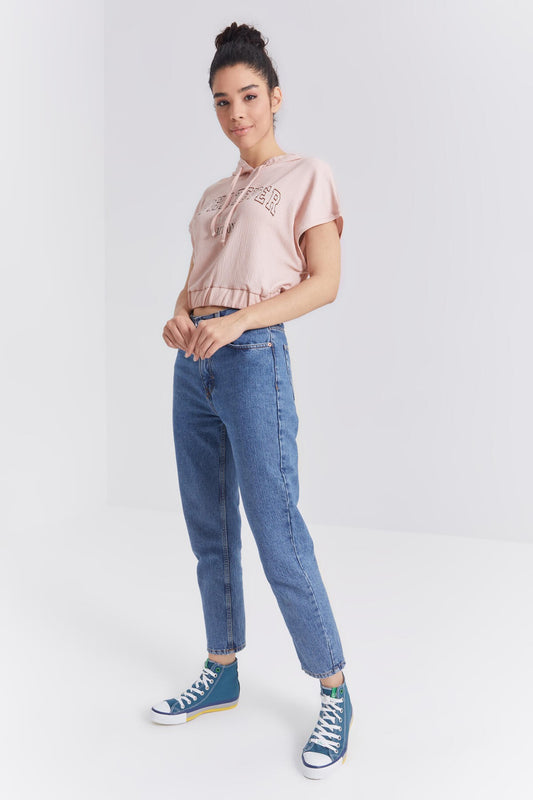 Salmon Hooded Letter Print Elastic Waist Crinkle Fabric Women's Crop Top T-Shirt - 97230