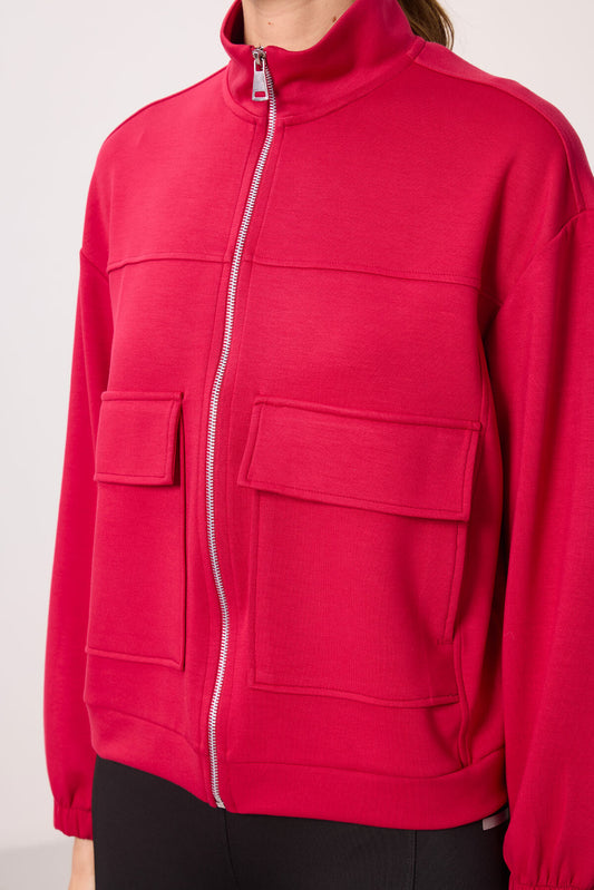 Viva Red Soft Textured High Collar Oversize Cargo Pocket Women's Crop Top Sweatshirt - 97301