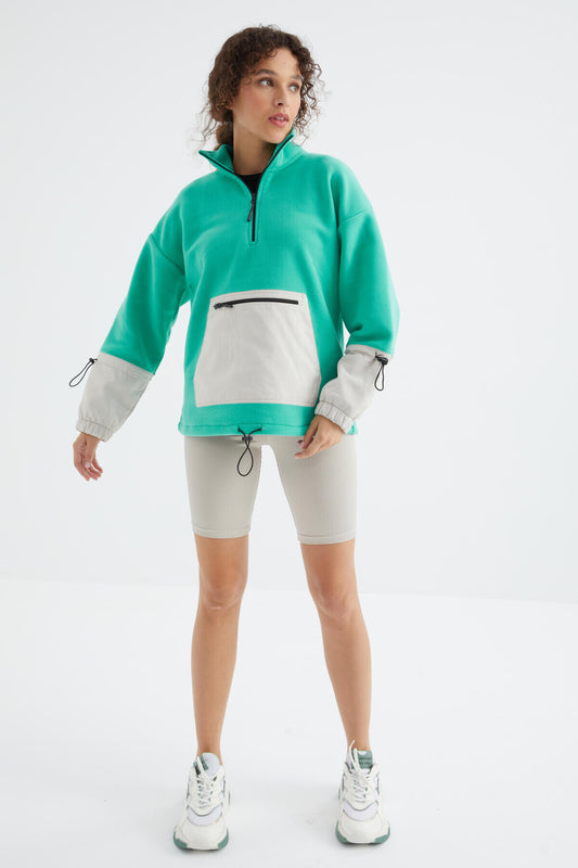 Half-Zip Skirt with Gathered Hem and Stand-Up Collar Oversize Women's Fleece Sweatshirt - 97236