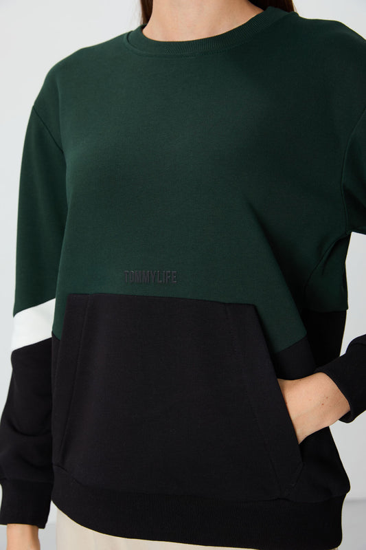 Forest Green Compact Cotton Thick Smooth Textured O Collar Oversize Fit Women's Sweatshirt - 97289
