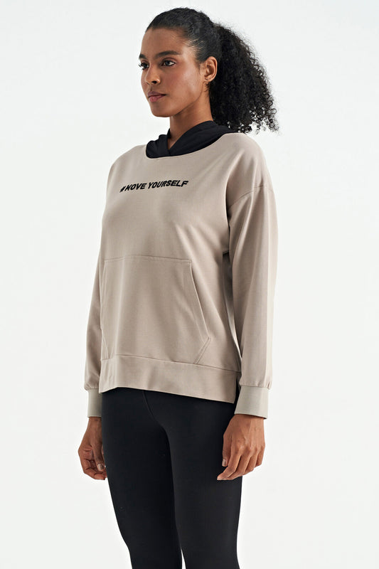 Dark Beige Women's Hooded Kangaroo Pocket Oversize Sweatshirt - 97161