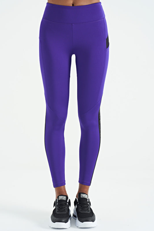 Dark Purple Front Back Strip Detailed Hidden Pocket High Waist Slim Fit Women's Tights - 94630