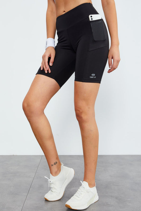 Black High Waist Wrap-up Women's Biker Tights with Side Pockets - 91010