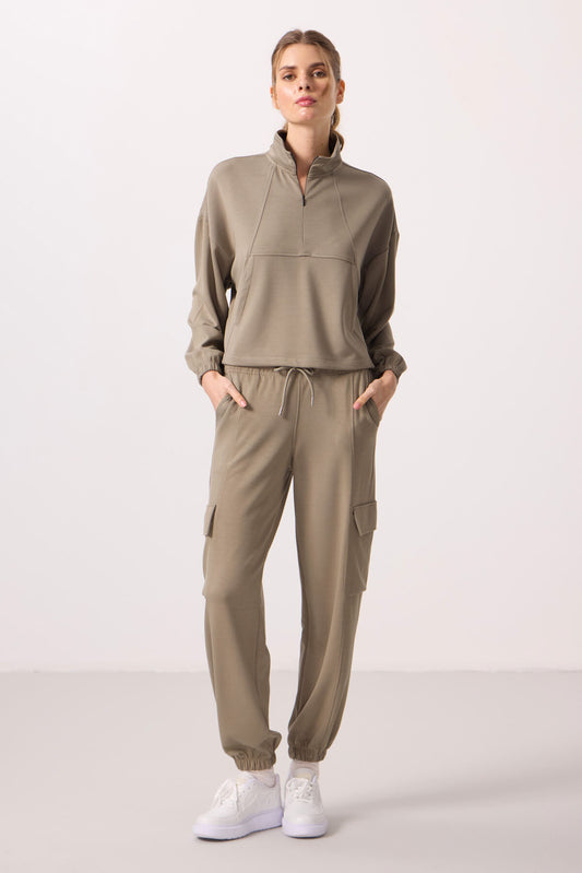 Dark Beige Soft Textured High Collar Oversize Elastane Women's Tracksuit Set - 95349