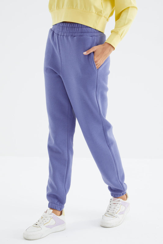Light Purple High Waist Brushed 3-Thread Cotton Basic Women's Tracksuit Bottom - 94624