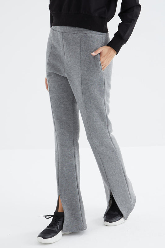 High Waist Gray Melange Front Slit Detailed Side Pocket Comfortable Fit Women's Tracksuit Bottom - 94625