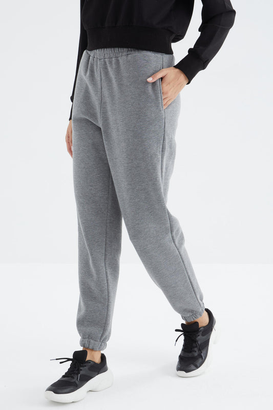 Grey Melange High Waist Brushed 3-Thread Cotton Basic Women's Tracksuit Bottom - 94624