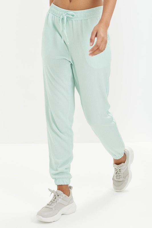 Mint Green Waist Gathered Laced Jogger Crepe Fabric Women's Tracksuit Bottom - 94620