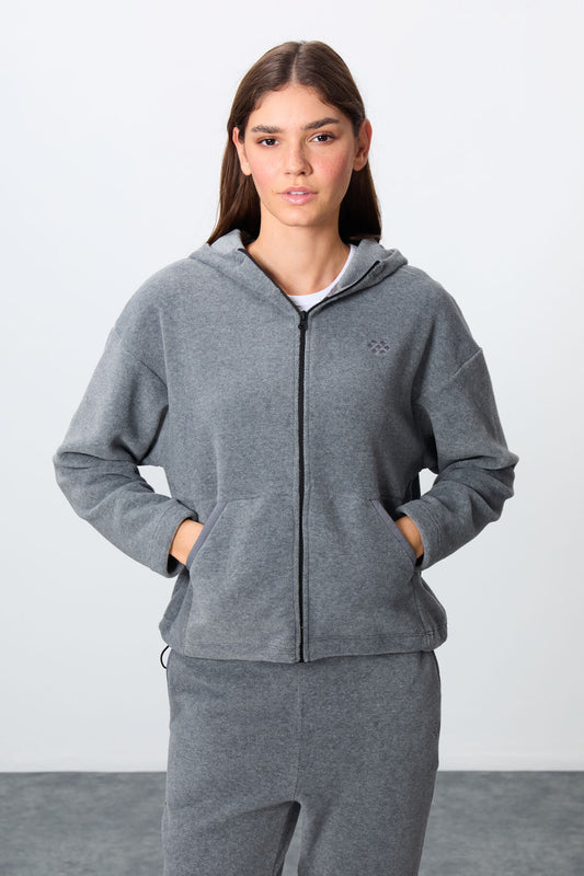Grey Melange Thick Soft Textured Hooded Oversize Embroidered Fleece Women's Tracksuit Set -95338