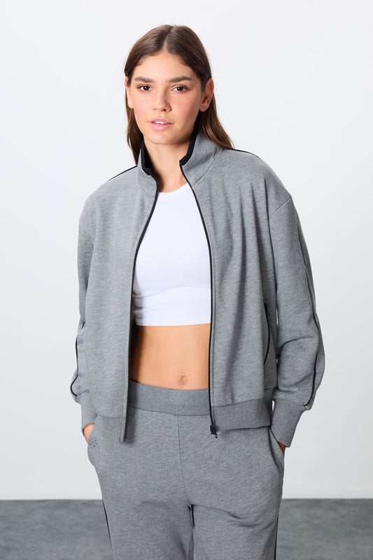 Grey Melange Compact Cotton Thick Smooth Textured Stand Collar Oversize Fit Women's Tracksuit Set - 95342