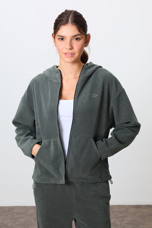 Green Soft Textured High Collar Oversize Elastane Women's Tracksuit Set - 95349