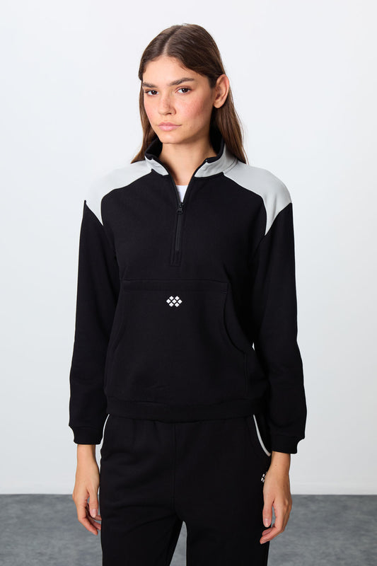 Black Compact Cotton Thick Smooth Textured Stand Collar Oversize Fit Women's Tracksuit Set - 95340
