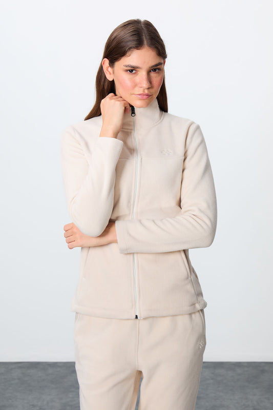Thick Soft Textured High Collar Oversize Embroidered Fleece Women's Tracksuit Set -95339