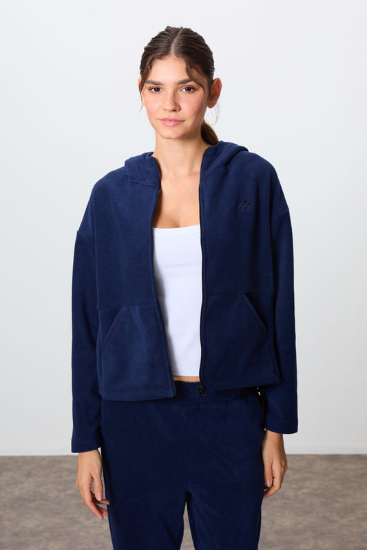Navy Blue Thick Soft Textured Oversize Embroidered Hooded Fleece Women's Tracksuit Set -95338