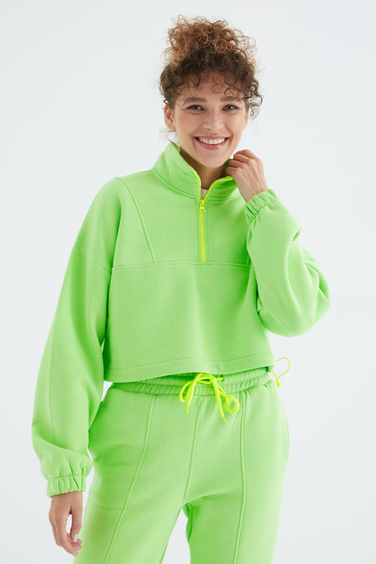 Forest Green Compact Cotton Thick Smooth Textured Stand Collar Oversize Fit Women's Tracksuit Set - 95340