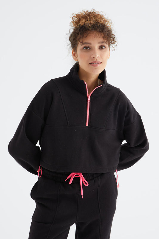 Black Low Shoulder Waist Gathered Half Zip Oversized Women's Tracksuit Set - 95321