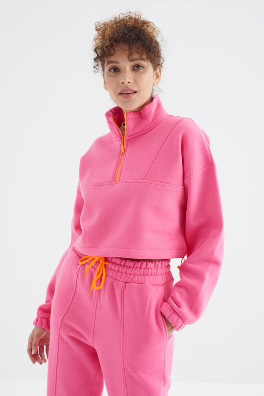 Sugar Pink Low Shoulder Waist Gathered Half Zip Oversized Women's Tracksuit Set - 95321