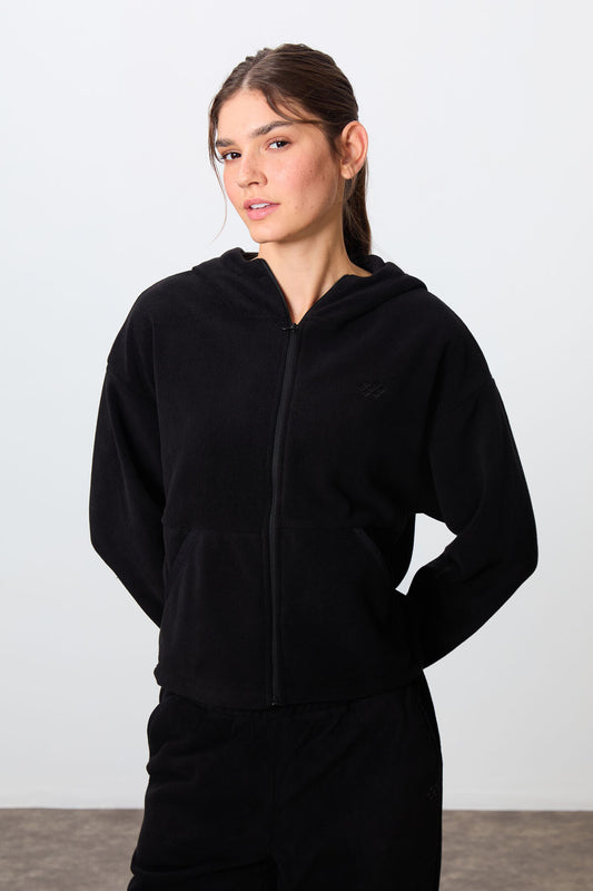 Black Thick Soft Textured Hooded Oversize Embroidered Fleece Women's Tracksuit Set -95338