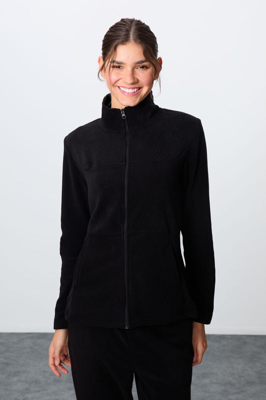 Black Thick Soft Textured Stand Collar Oversize Embroidered Fleece Women's Tracksuit Set -95339