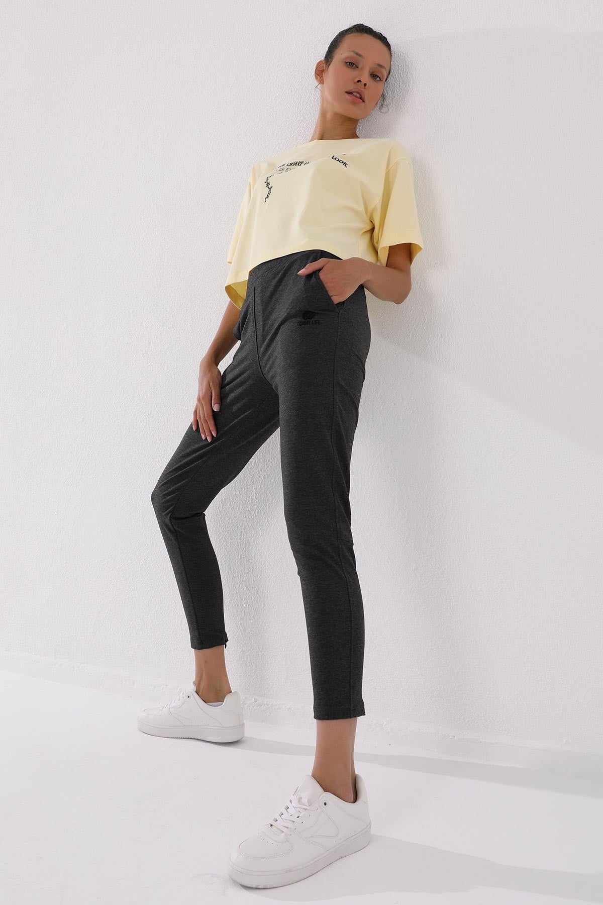 Anthracite Melange Zippered Cuffed Pocket Comfort Fit Women's Tracksuit Bottom - 94246