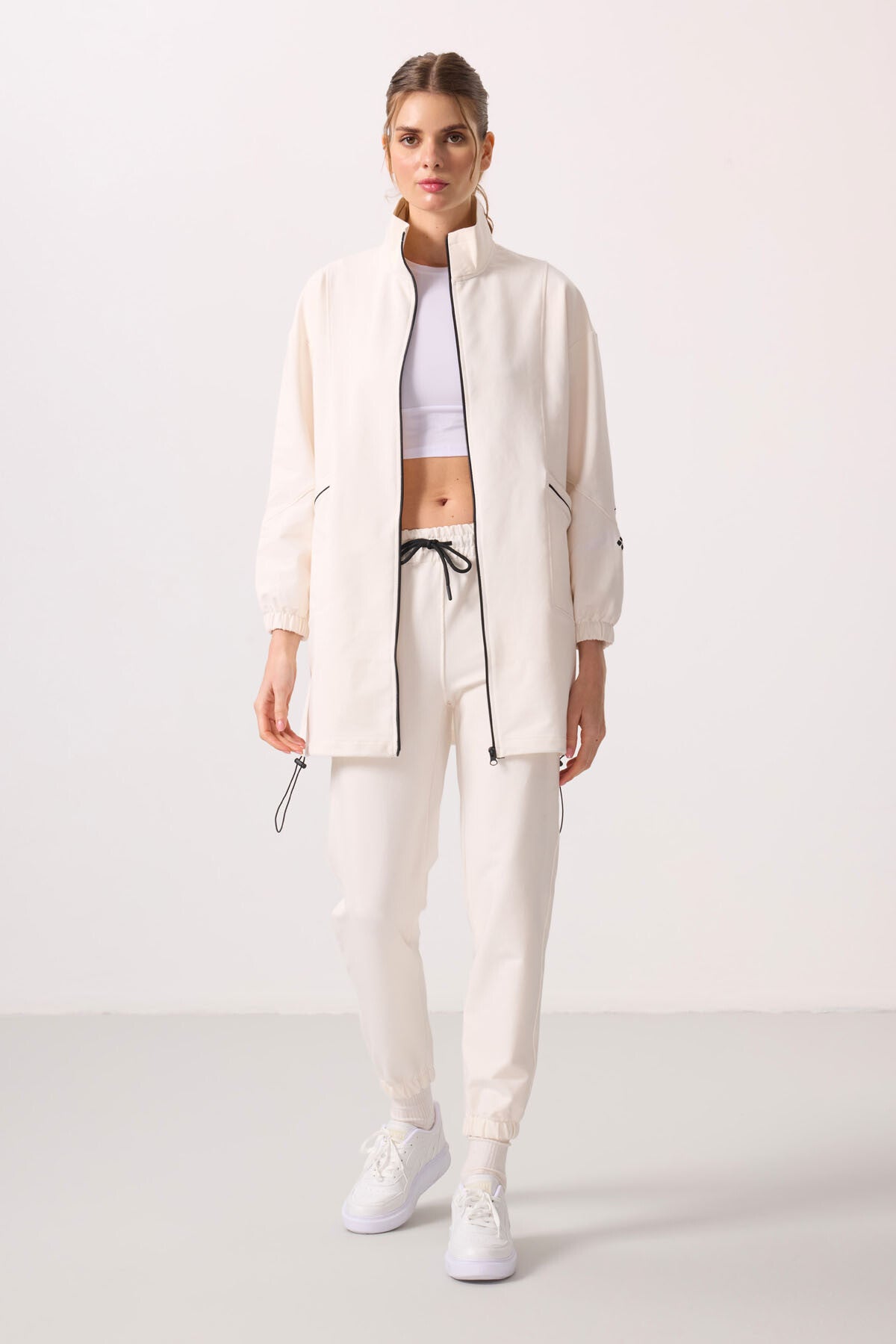 Beige High Collar Zippered Comfortable Fit Women's Tracksuit Tunic Set - 95345