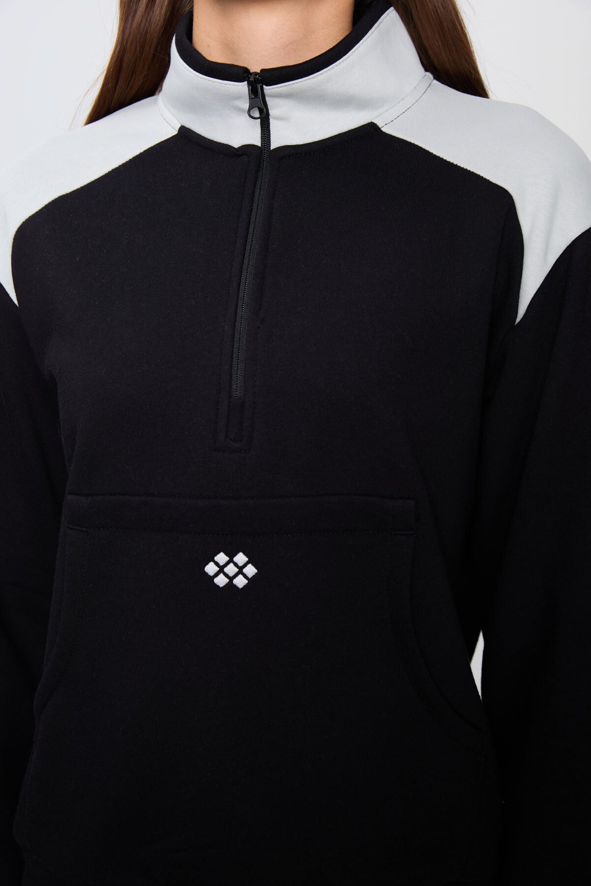 Black Compact Cotton Thick Smooth Textured Stand Collar Oversize Fit Women's Tracksuit Set - 95342