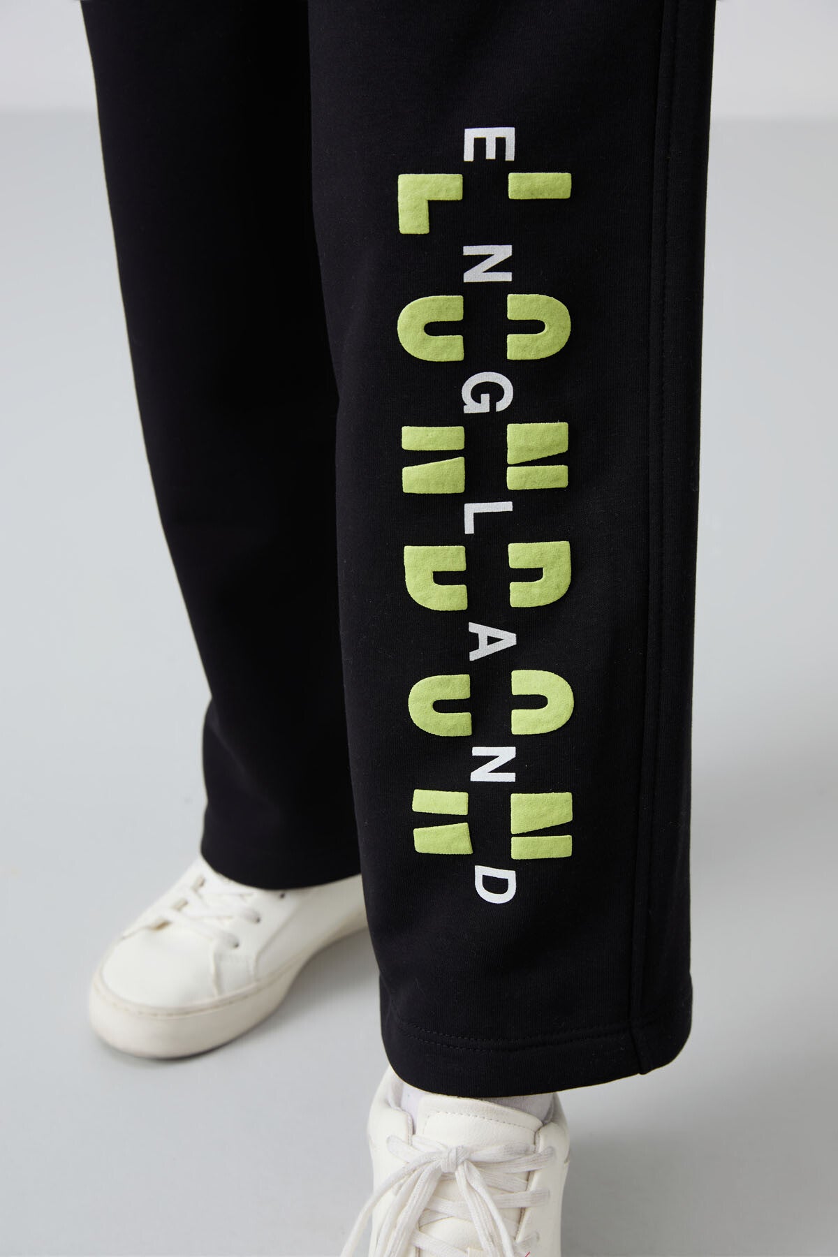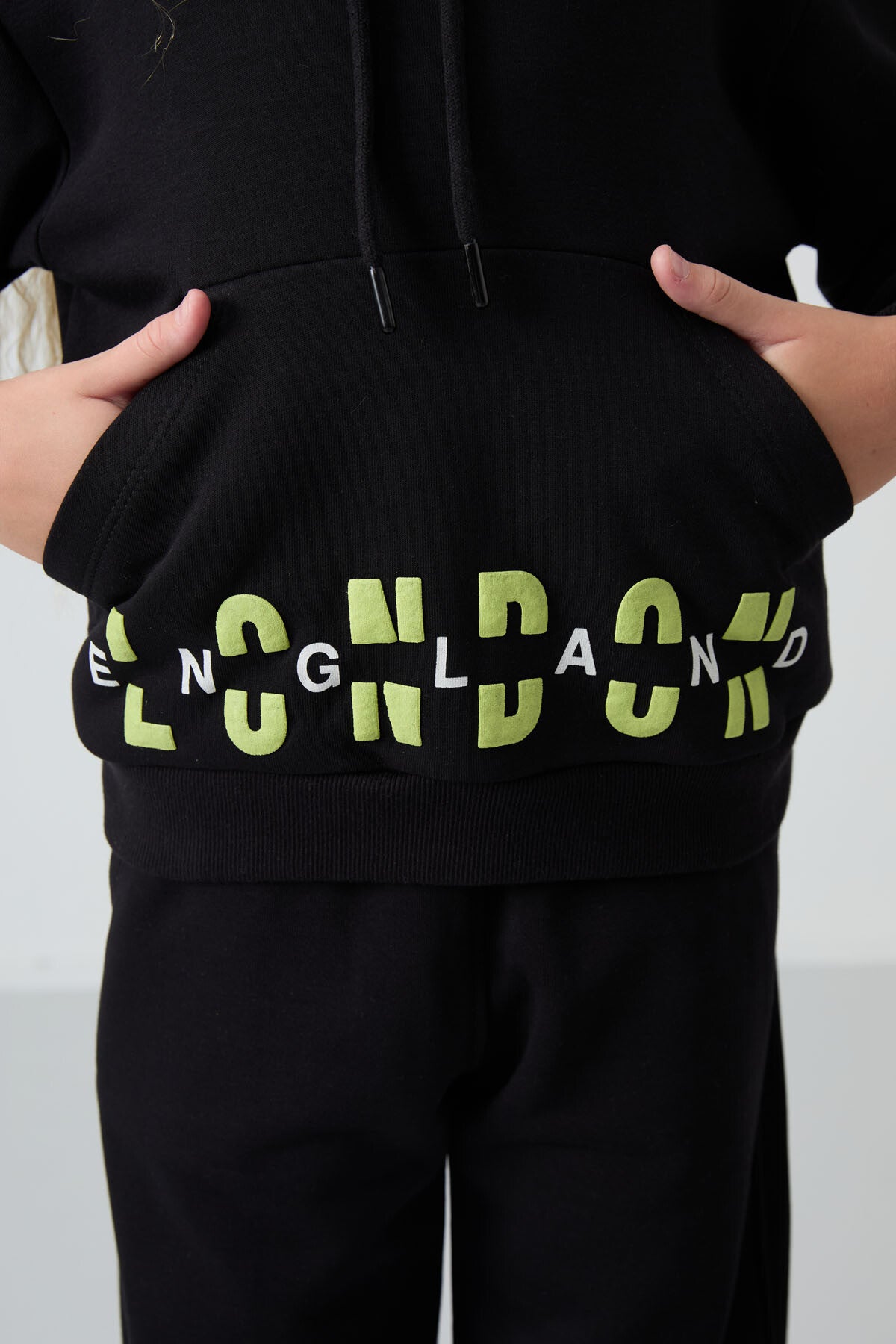 Black Cotton Fleece-Lined Soft Textured Oversize Printed Girls' Tracksuit Set - 75147