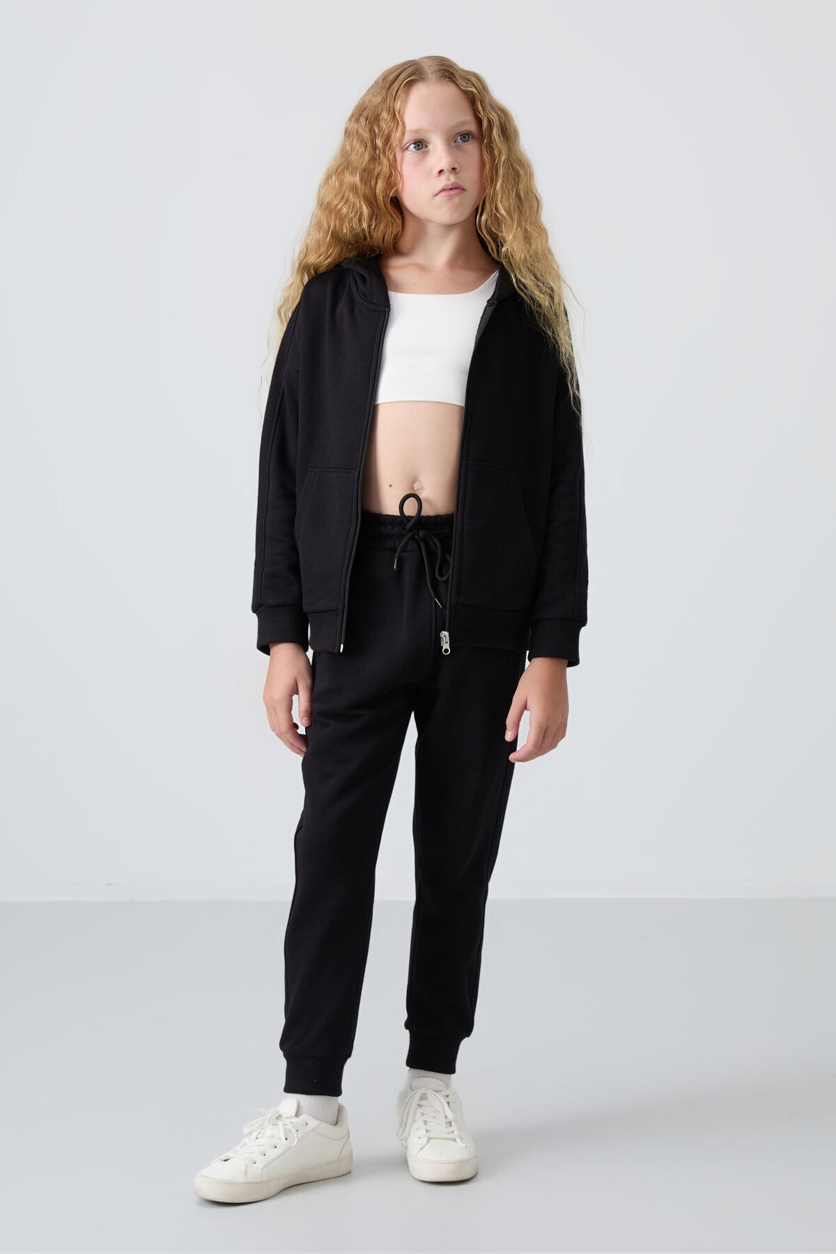 Black Cotton Fleece-Lined Soft Textured Standard Fit Embroidered Girls' Tracksuit Set - 75148