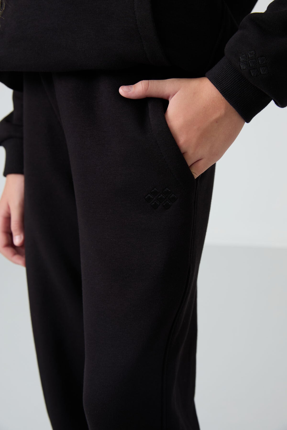 Black Cotton Fleece-Lined Soft Textured Standard Fit Embroidered Girls' Tracksuit Set - 75162