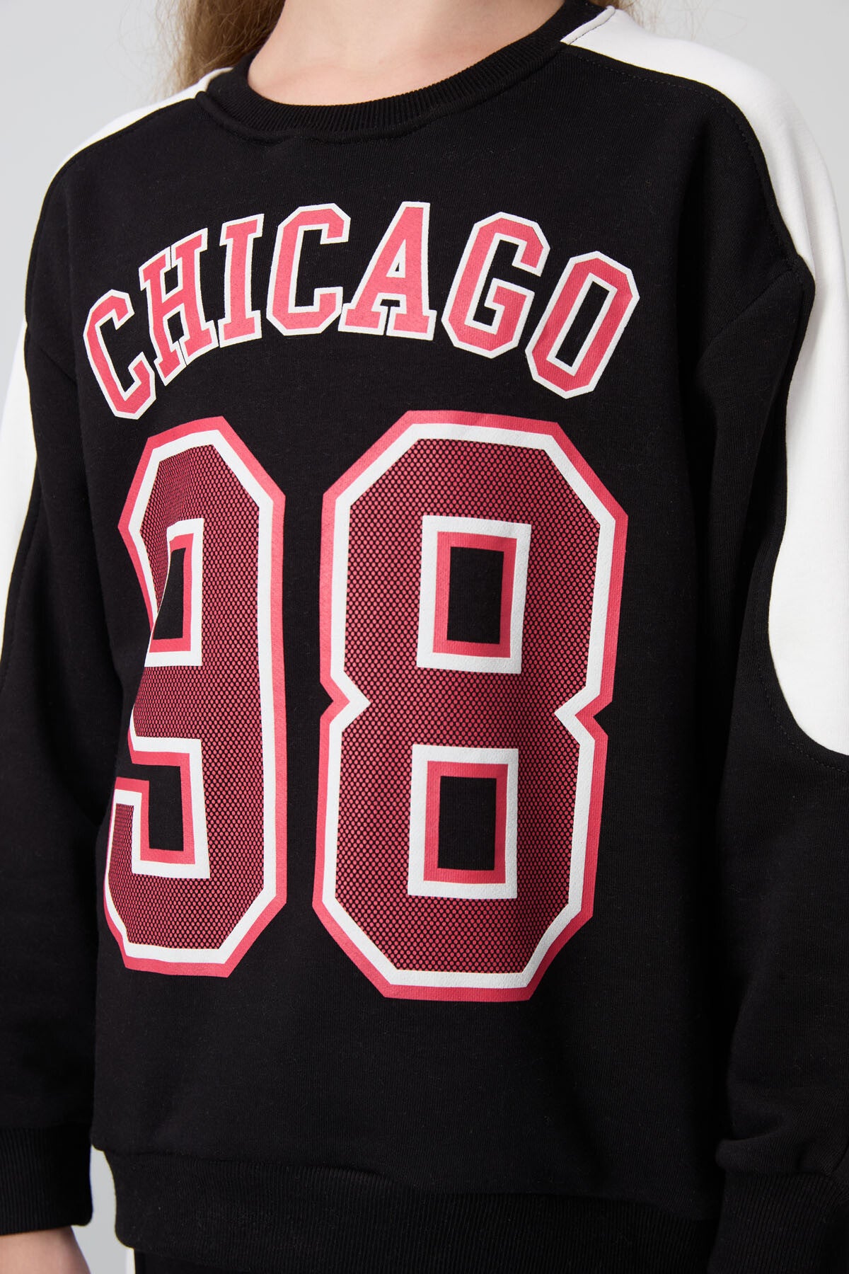 Black Cotton Fleece-Lined Soft Textured Standard Fit Embroidered Girls' Tracksuit Set - 75170