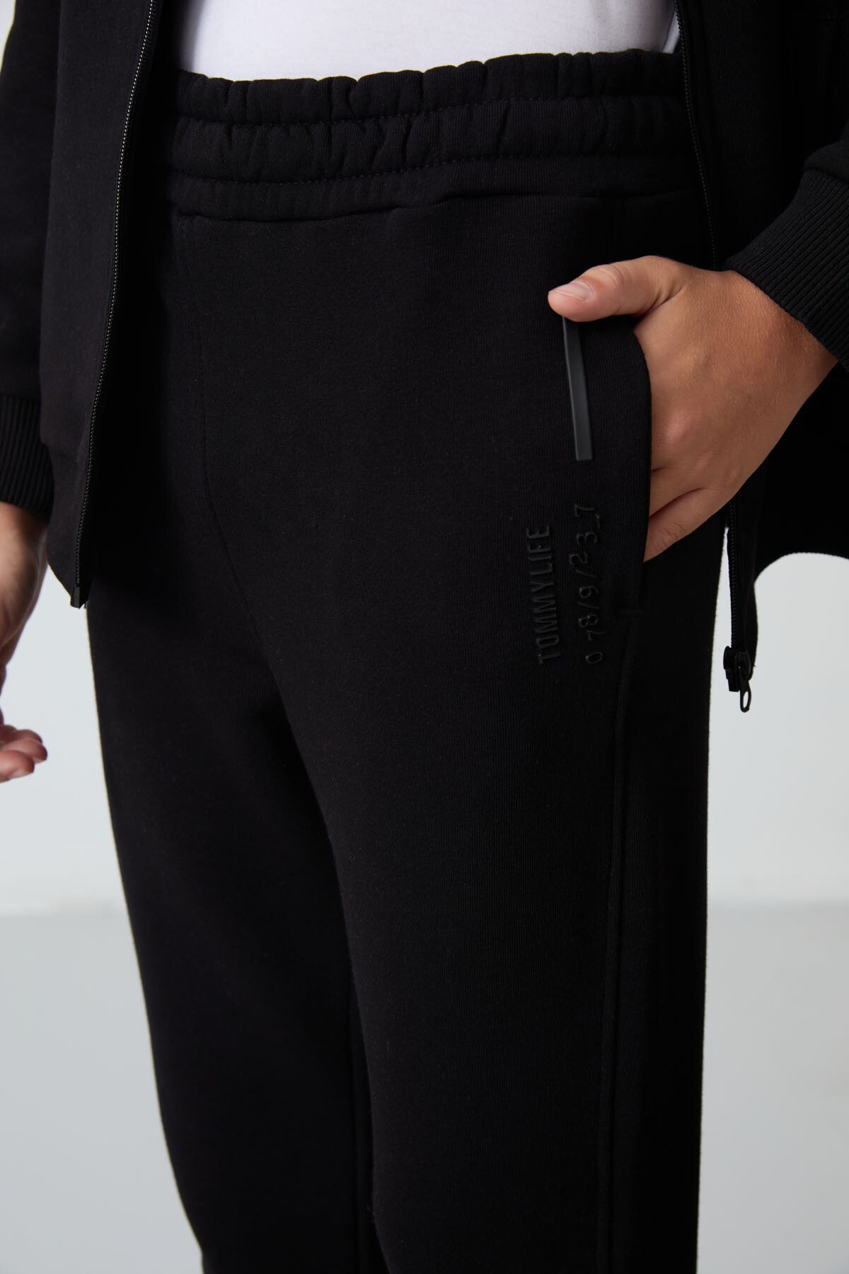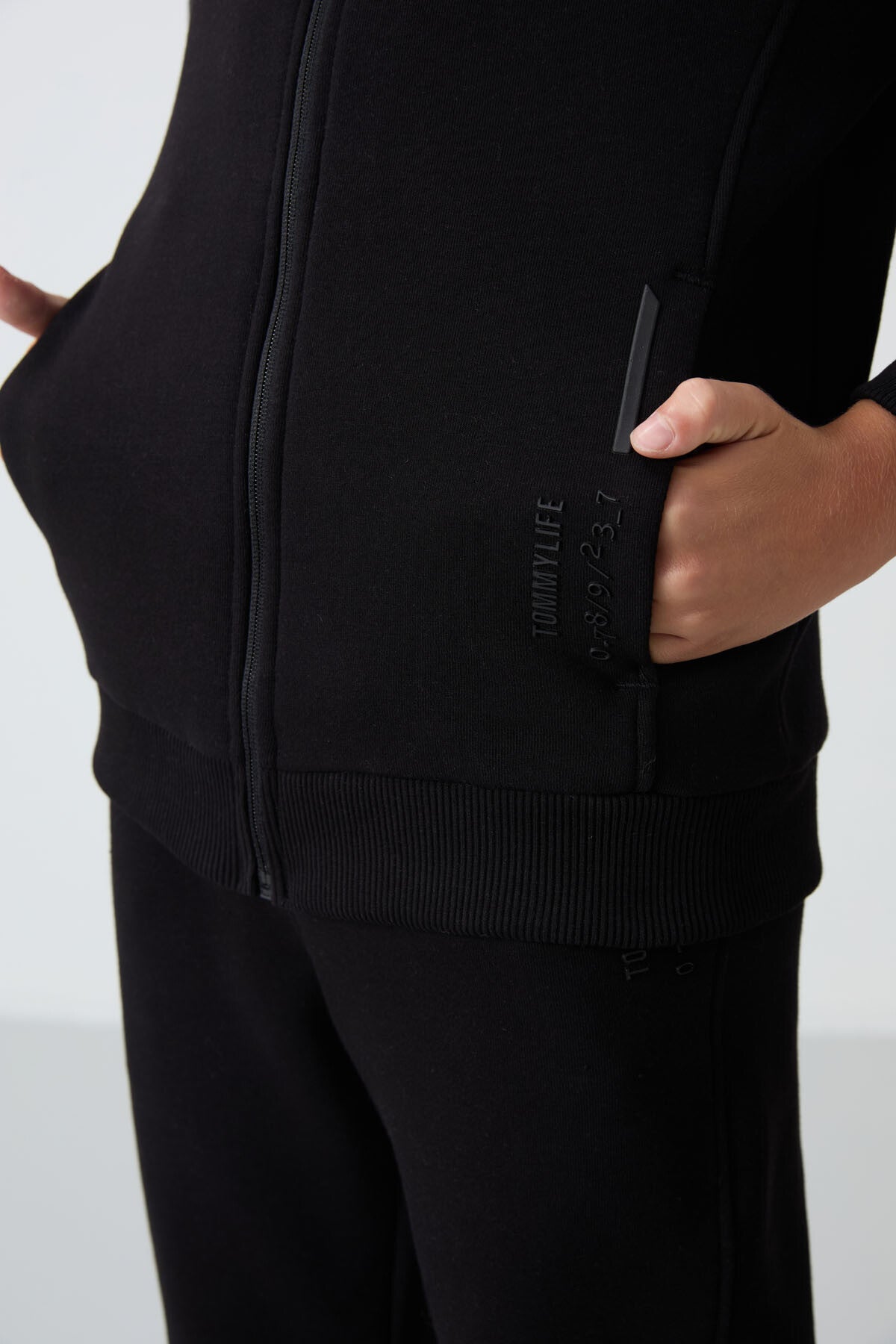 Black Cotton Thick Fleece-Lined Soft Textured Standard Fit Embroidered Boys' Tracksuit Set - 11240