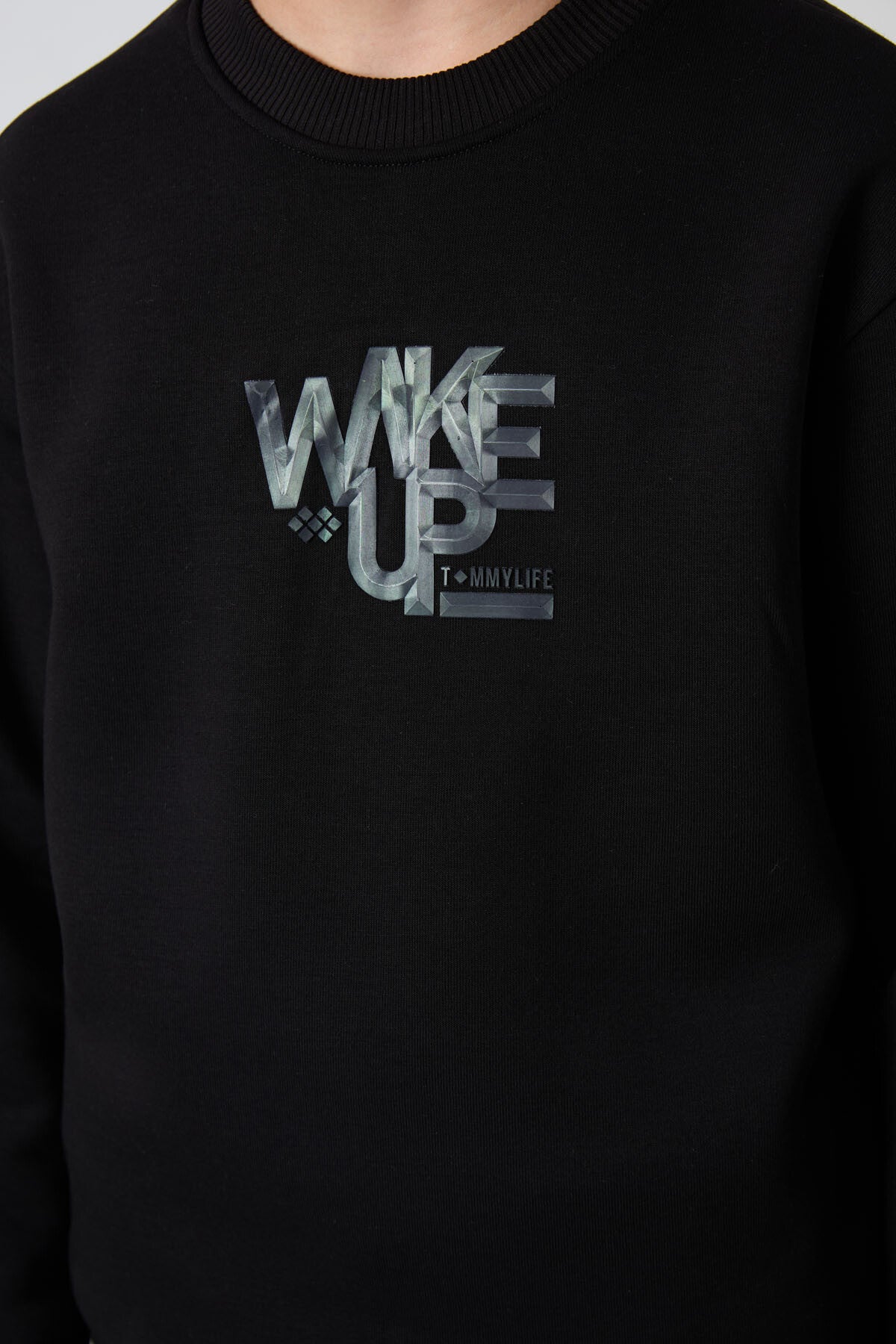 Black Cotton Thick Fleece-Lined Soft Textured Standard Fit Printed Boys' Tracksuit Set - 11253