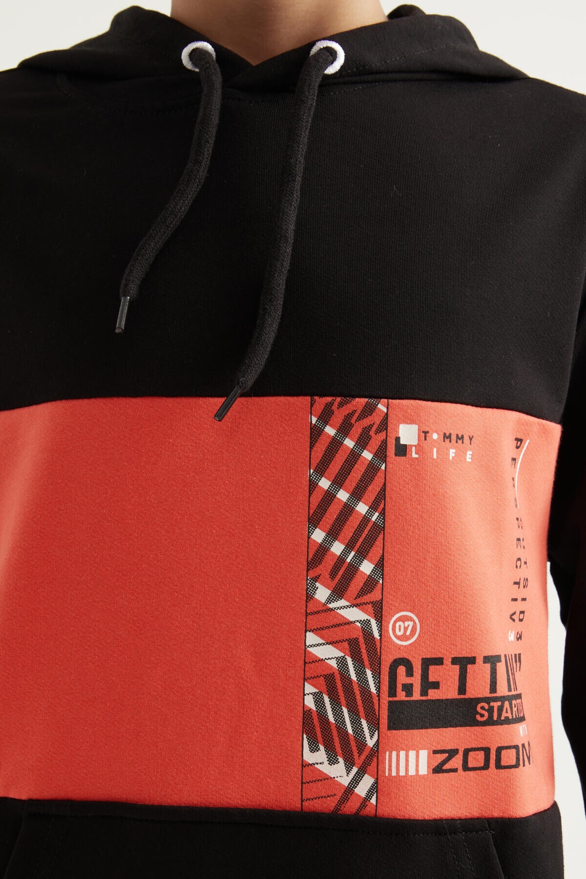 Black Embroidered Kangaroo Pocket Hooded Standard Fit Boys' Sweatshirt - 11010