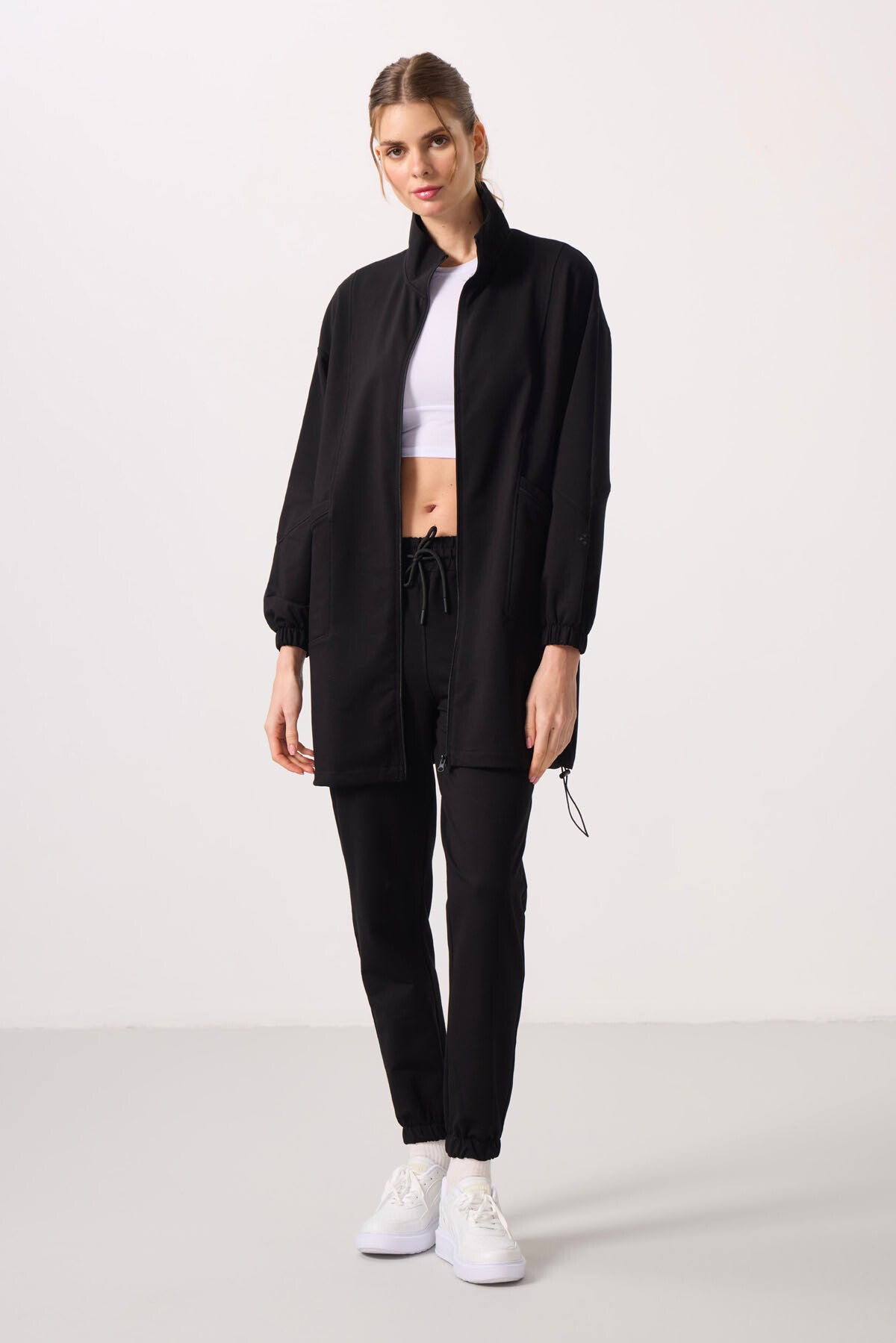 Black High Collar Zippered Comfort Fit Women's Tracksuit Tunic Set - 95345