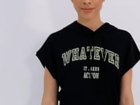 Black Hooded Print Waist Elastic Crepe Fabric Women's Crop Top T-Shirt - 97230