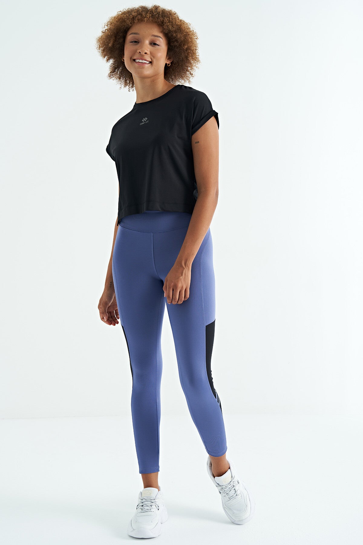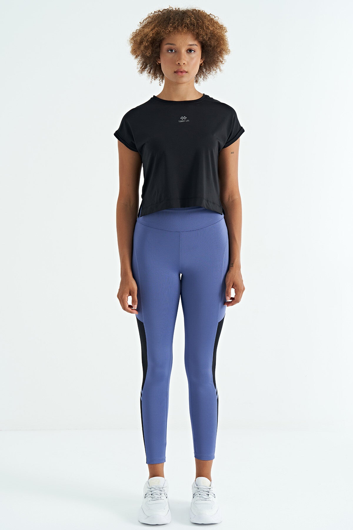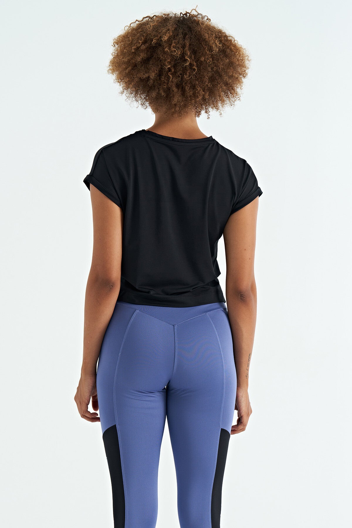 Black Logo Printed O Collar Low Sleeve Oversize Women's Crop T-Shirt - 97262