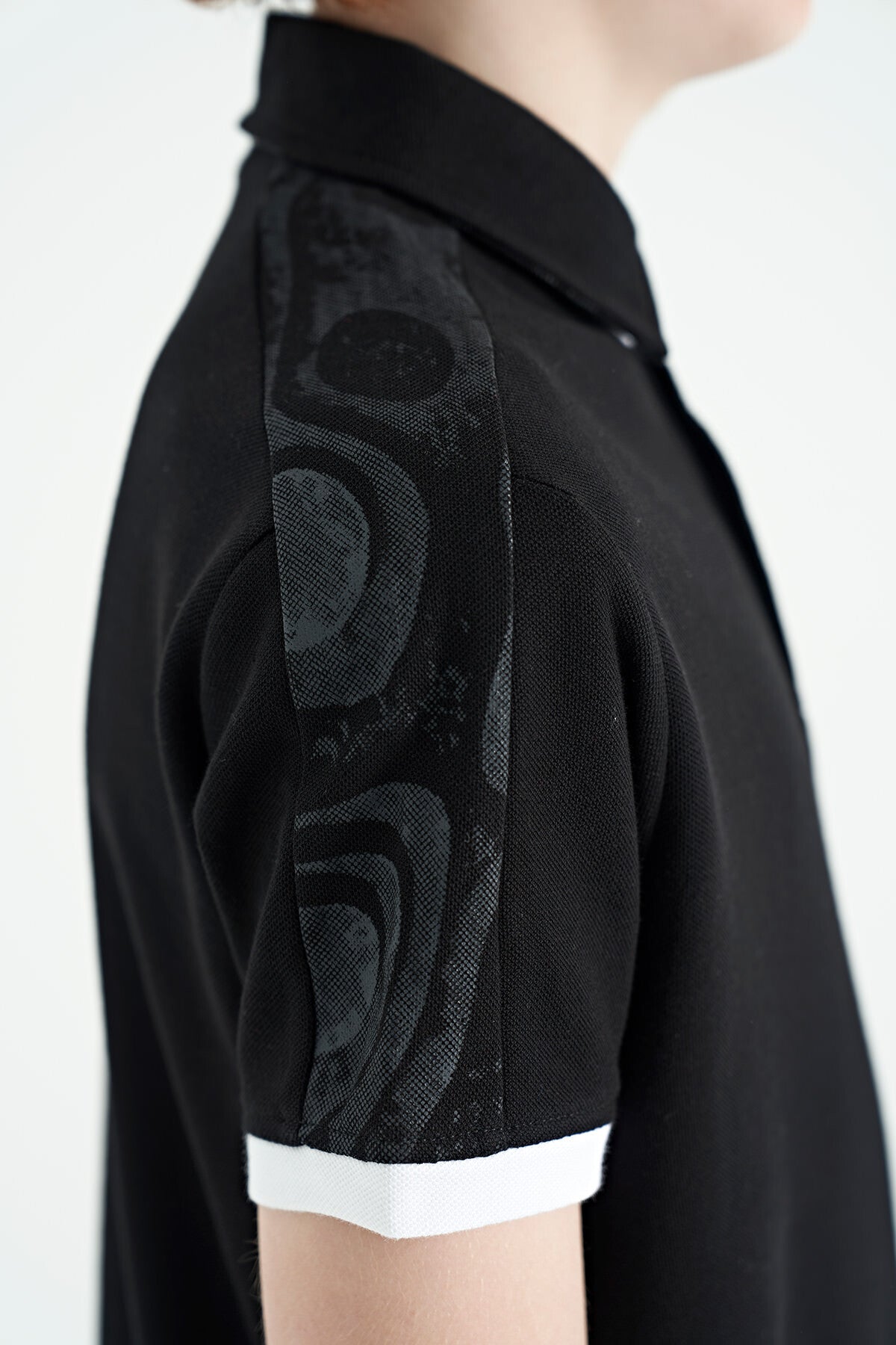Black Print Detailed Polo Collar Standard Cut Boys' T-Shirt - 11166