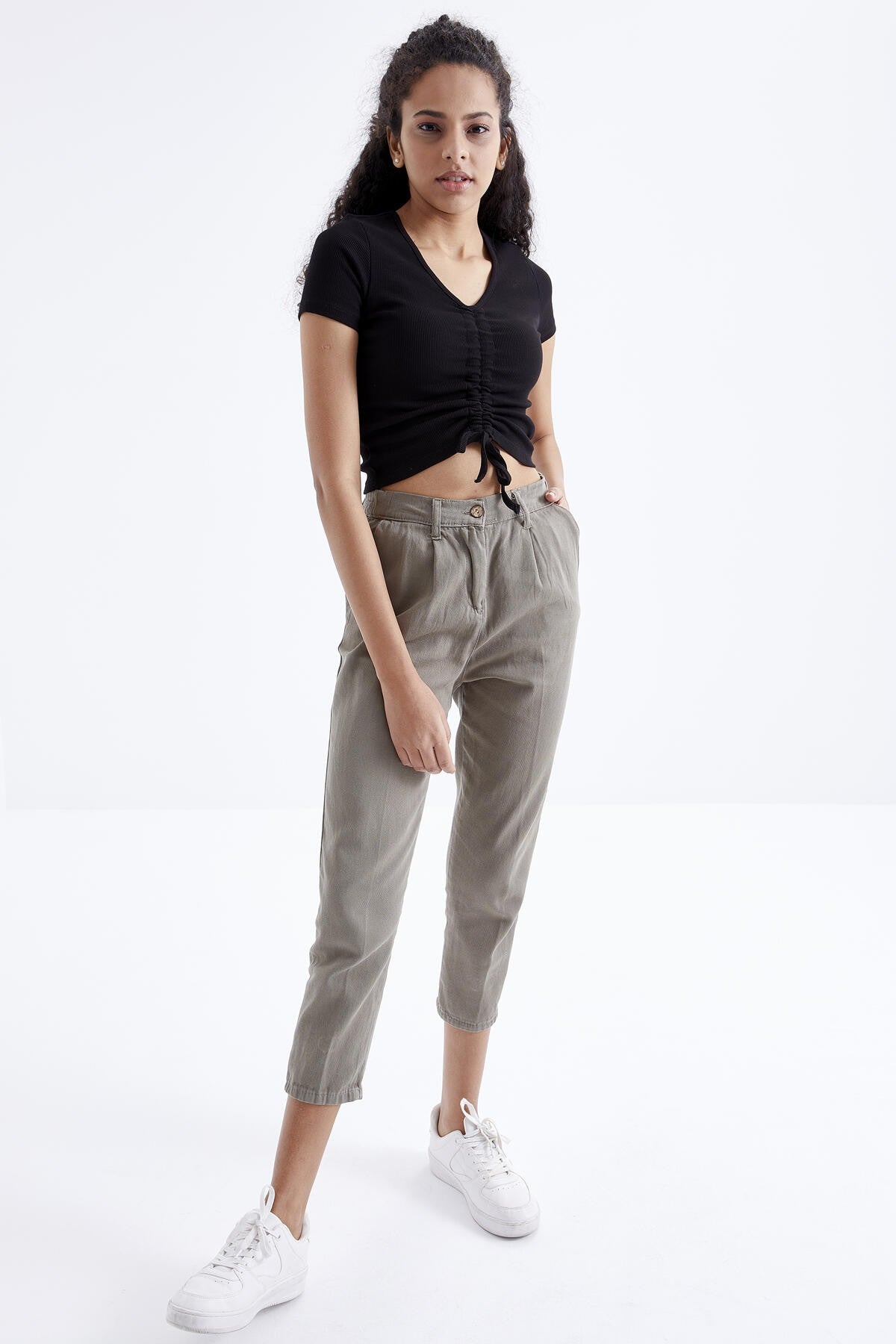 Black Ruffled Detailed V-Neck Women's Crop Top T-Shirt - 97205