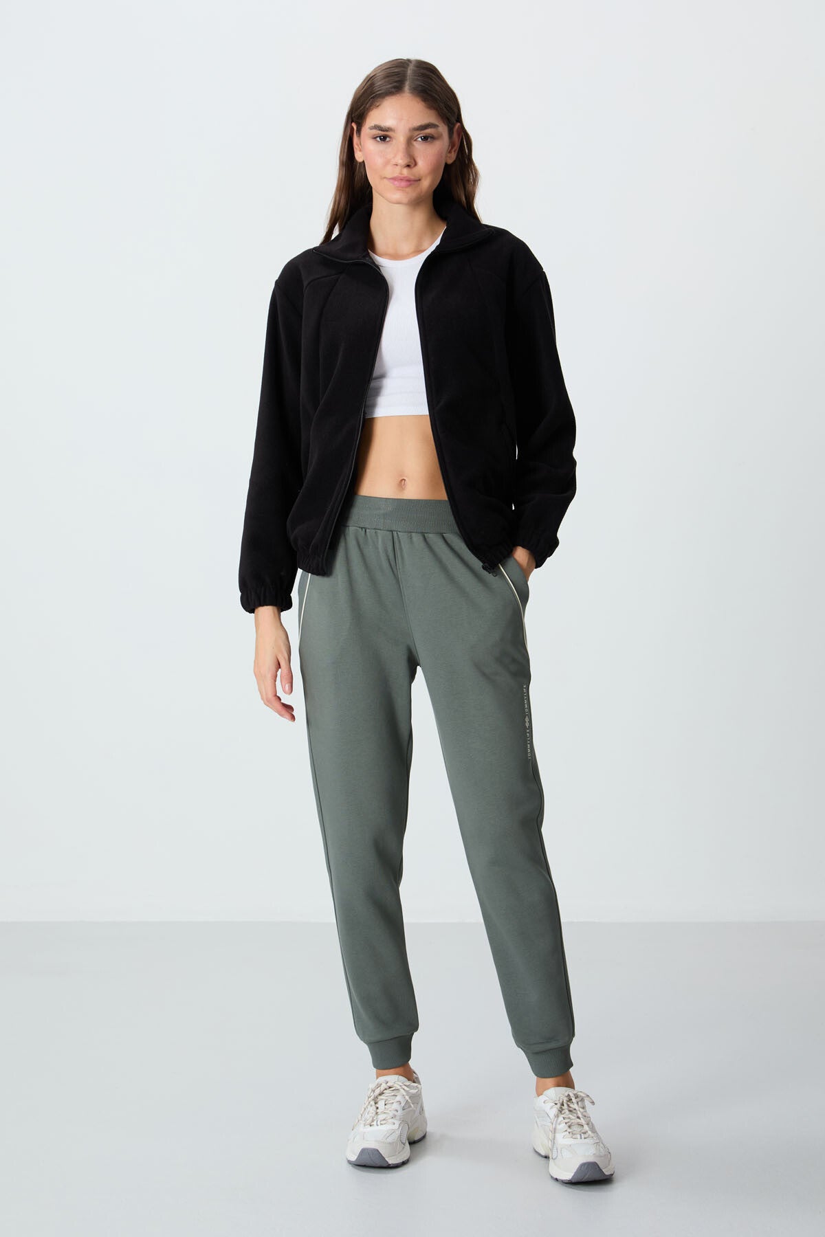 Black Thick Soft Textured High Collar Oversize Embroidered Fleece Women's Sweatshirt - 97293
