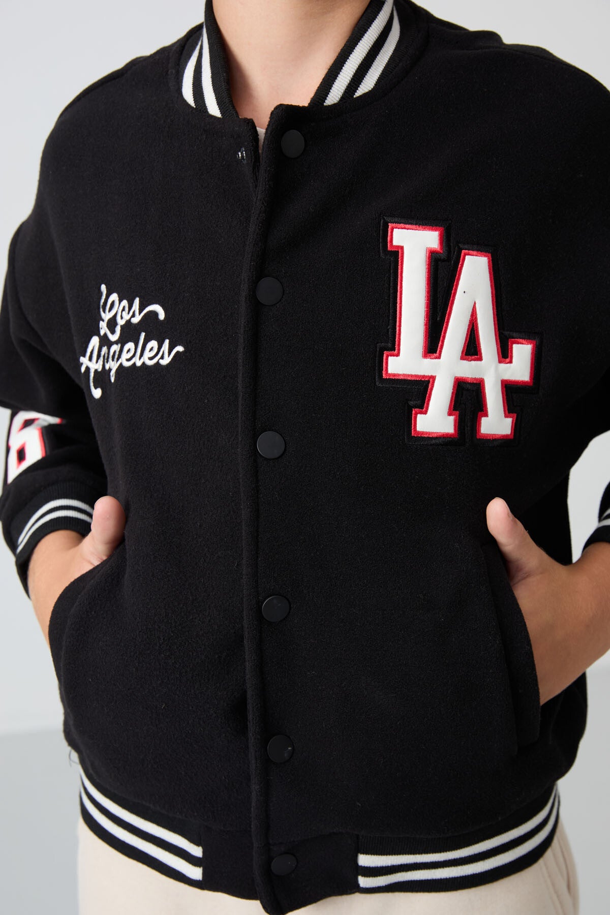 Black Thick Soft Textured Standard Fit Embroidered Fleece Boys' College Jacket - 11227