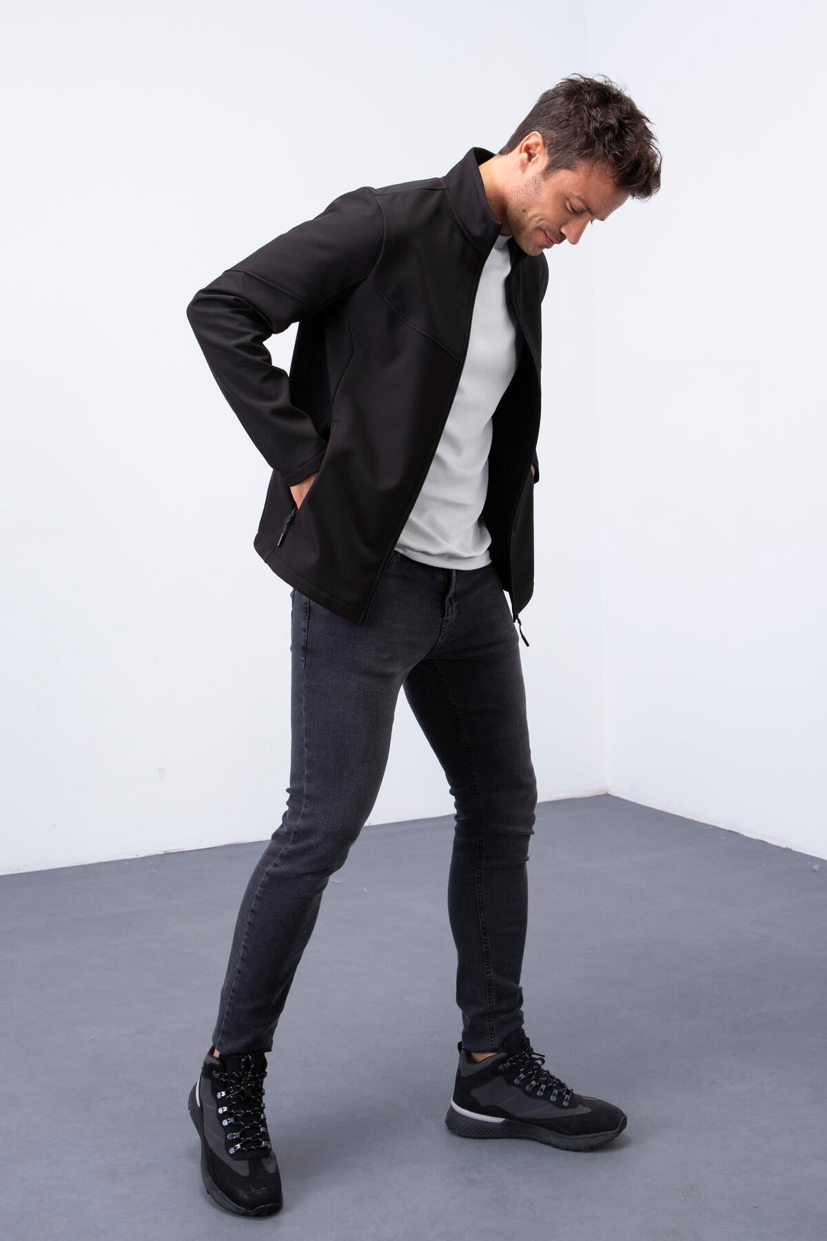 Black Zippered High Collar Water and Windproof Softshell Men's Jacket - 88050